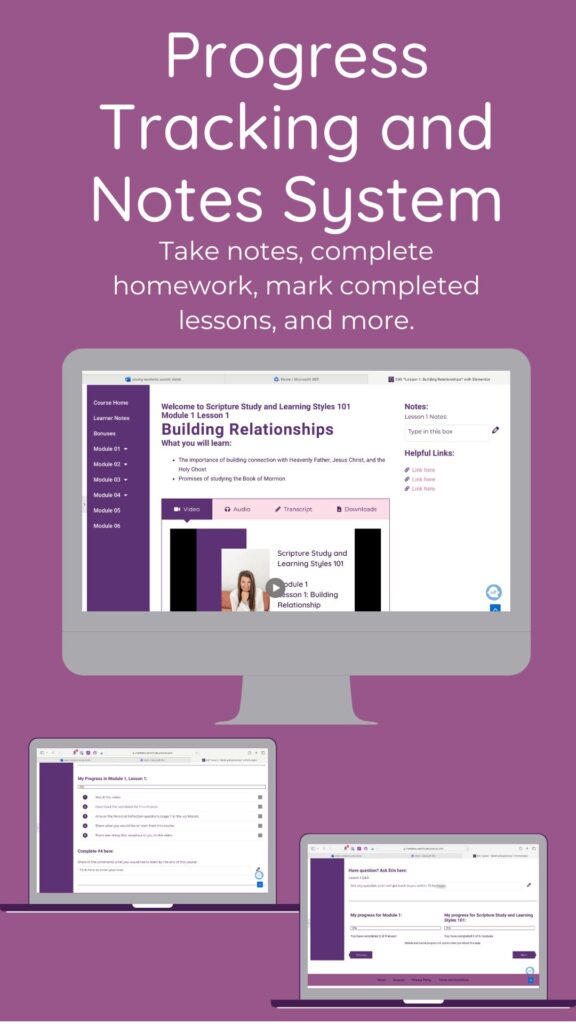 Check off the lessons you have completed, take personal notes, ask questions, track progress, complete homework, and more all on the updated course platform.